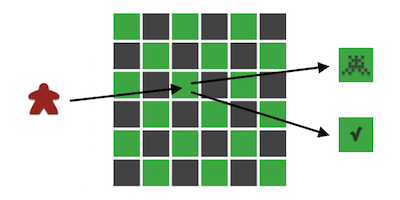 For our test game, the two first questions are easy to answer. Your role is a test lead and your goal is to find bugs. To ”gamify” those concepts, we convert them into game components by letting our testers be represented by game pieces and our test environment be represented by a game board. To play the game, simply place a tester on a square and draw a tile to see if you find a bug.
