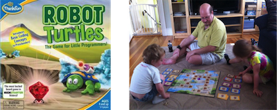 More modern examples include the game Robot Turtles, invented by the software entrepreneur Dan Shapiro to teach his 4-year old twins programming. Basically, the players play cards to program their turtles to find crystals on a board. Robot Turtles was a huge Kickstarter success with $630,000 raised and 25,000 games shipped.