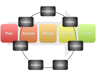 Our journey will start with the fundamental test process of Plan-Analyze-Design-Execute-Close. For each of those activities we add game elements to strengthen the learning: