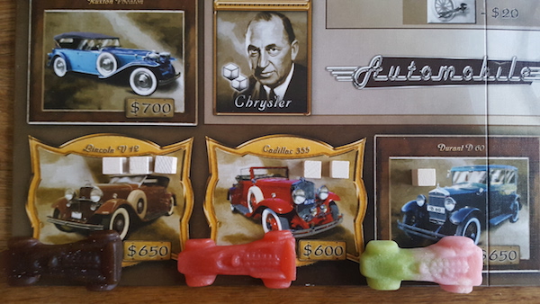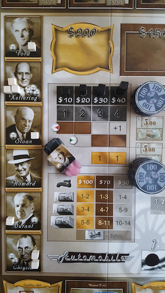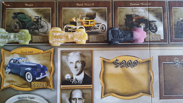 The factory spaces are neatly arranged in a clockwise pattern around the game board where each new space introduces a more modern (and more expensive) car model. This looks a bit like, although I shudder to mention the game in the same sentence as Automobile, how the streets in Monopoly are organized. Rest assured that there are no other similarities between those games!