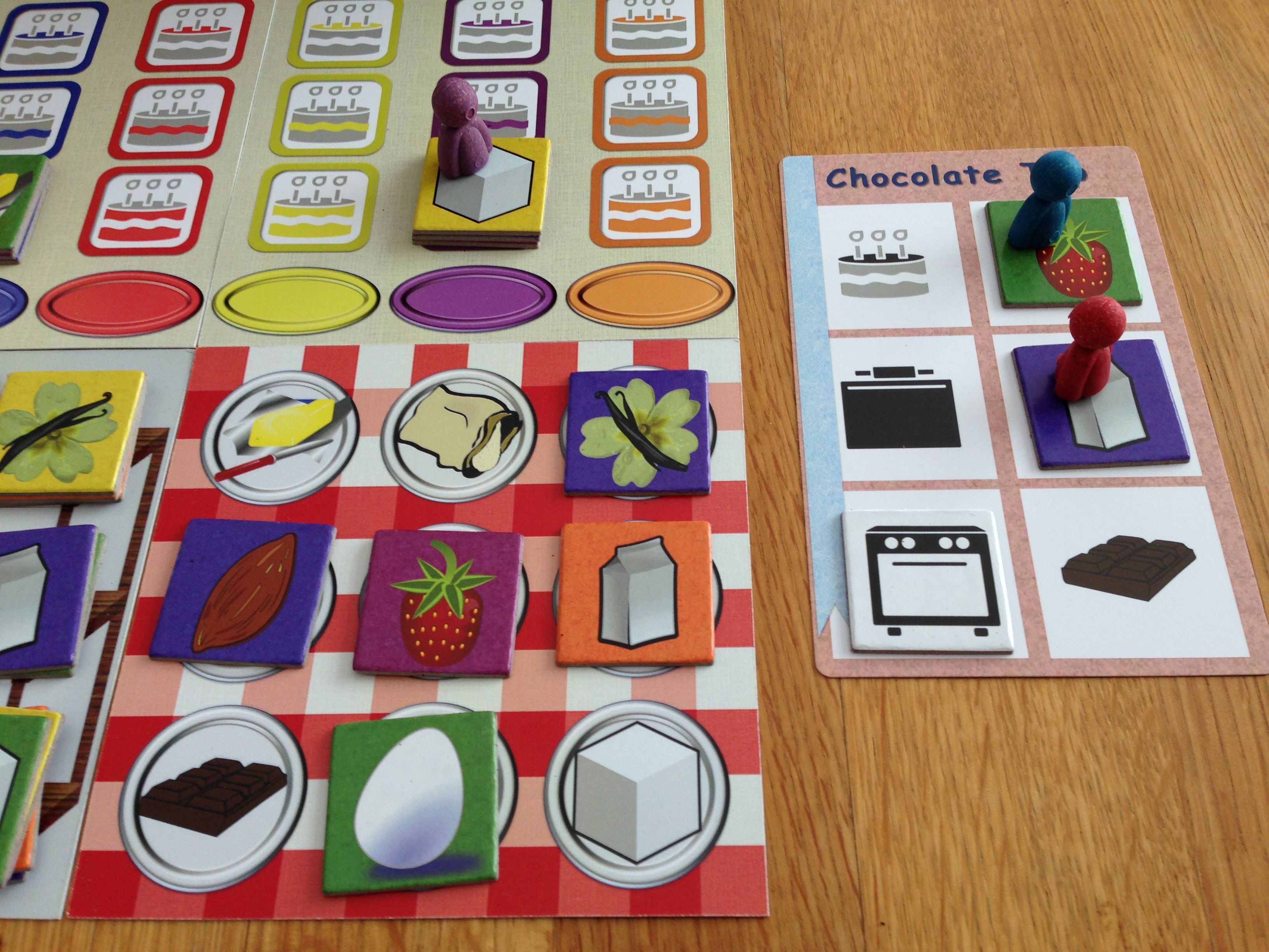 The actual "production" was kept simple so instead of allocating workers or paying gold, the players simply take what they need, 1 at the time. However, I did introduce kitchen tools in the middle of the value chain (for the preparations of parts) as a limited resource and a way to block each others' progress. Finally, and as an extra twist to the end, I introduced the "Reiner Knizia" style scoring of a cake contest where only the cake where most players have points is used in the final scoring. This created a game where a player who tries to add too many points to a cake will get nothing in the end, just like the famous Pythagorian Cup!