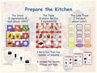 In Bake the Cake!, the players both cooperate and compete to bake the best cake. Players score by buying ingredients, preparing parts and baking cakes. Although the cakes belong to specific players, the players may freely use each others' ingredients and parts to bake them. All players participating in a cake will score but only when it is completed and only if the cake wins the final contest.