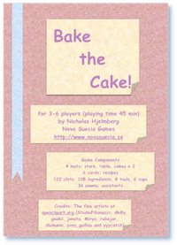 The challenge of Bake the Cake! is to bake a balanced cake which includes ingredients and parts from all players, while still having most points on the cake.