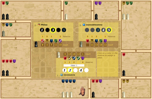paladins to your court only, and this is also how the initial turns usually play. But as colors and territories get claimed,