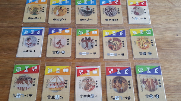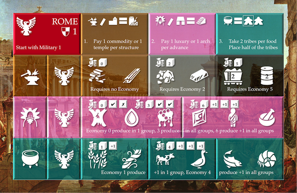 Another benefit would be the possibility to include multiple victory conditions. Thematically it does make sense - Rome may have been military stronger than Greece but the Greek culture survived the Roman Empire. The tricky part of the design is to balance the different victory conditions so that not one civilization trait is stronger than another but that will be a later task for the game testing and tuning.