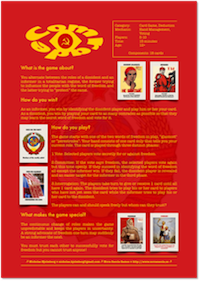 Comrade is a deduction game with the classic concept of hidden identities. Add to this the double objectives of an informer trying to find a dissident while the dissident tries to influence as many others as possible. Complete with shifting identities so that the players can never be sure who is currently the informer and who is currently the dissident. All this for 5-10 players but only 18 cards!