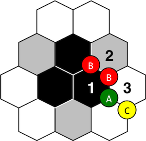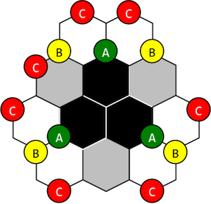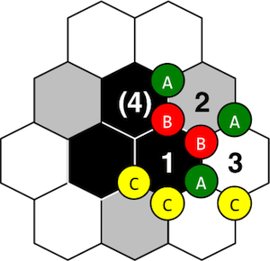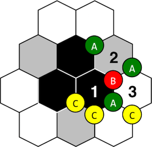 Let's take the extreme example to the left where player A has placed on 3 battle stations on triple points,