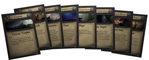 However, there are several restrictions regarding the actions. There are limits for how many cards you may draw of each category and one (and only one) Crusade must be undertaken per generation. The purpose is probably to prevent the game from stalling (games like Excalibur, where a player benefits more from building beehives than fighting other players, come to mind) but I'm not sure that this solution is right. Such restrictions may force the players into narrow paths with few opportunities to specialize and try out different strategies. Why not allow a Richard III, who collects all the worst imaginable traits and use them for Intrigues and Wars?