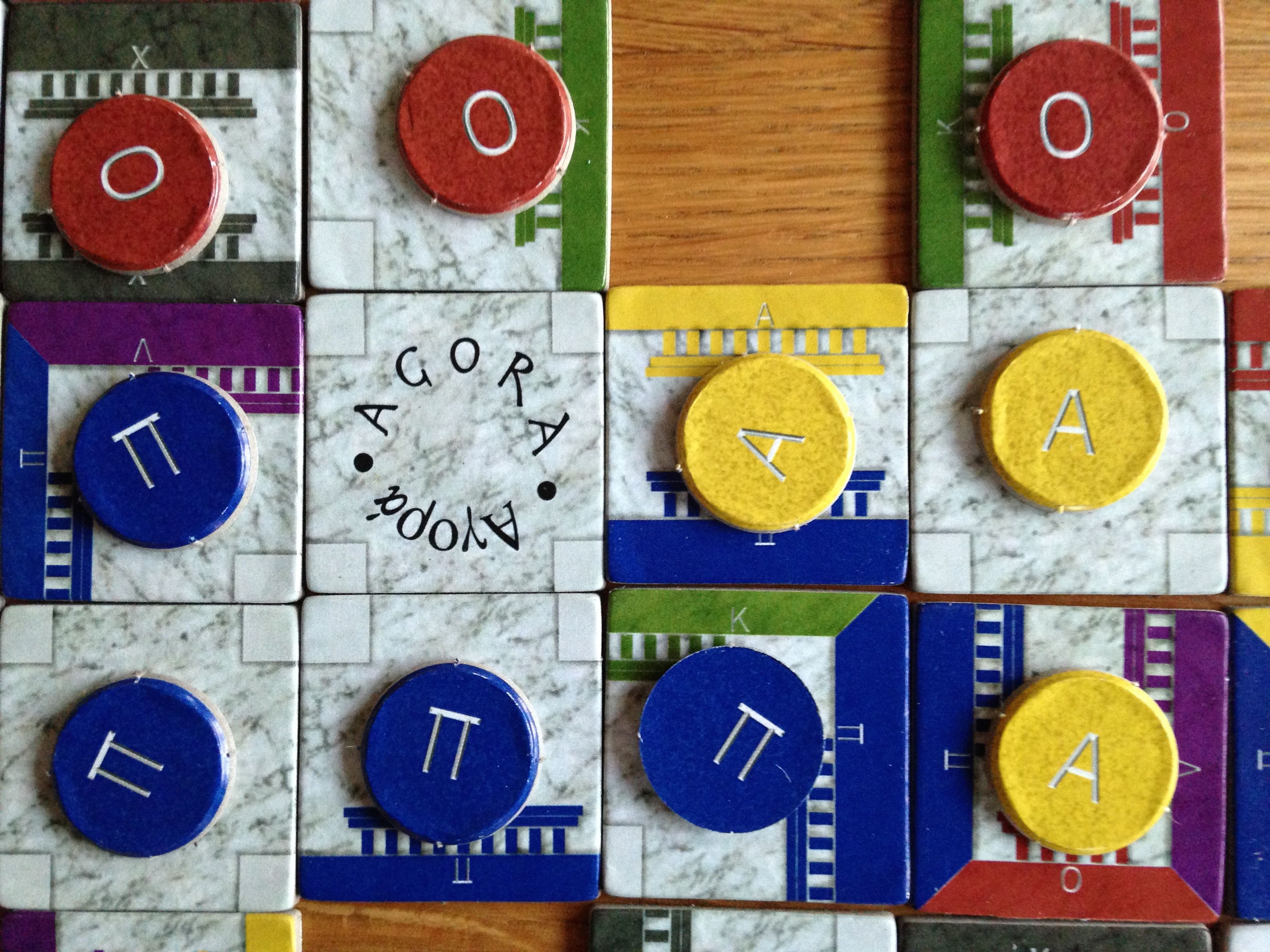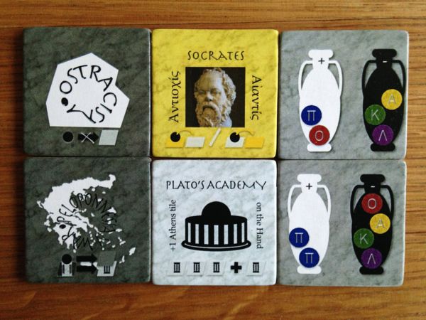 A lot of tweaking and tuning was required to find the optimal balance of tiles and colors, where the main outcome was the introduction of black "negative" buildings to make tile placements more challenging and to reduce the endgame "inflation" in power. They also added a new dimension to the game, as the players now had more options to modify the power. With that, I had a tightly balanced game, where the players have many small and simple options for modifying it in their own favor - not unlike the challenges the real demagogues of Classical Athens must have had!
