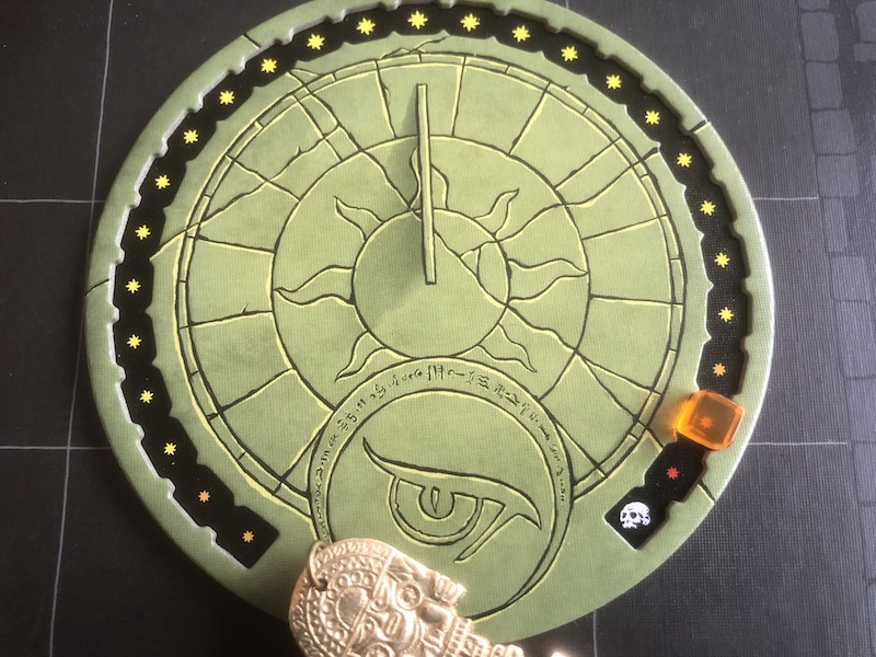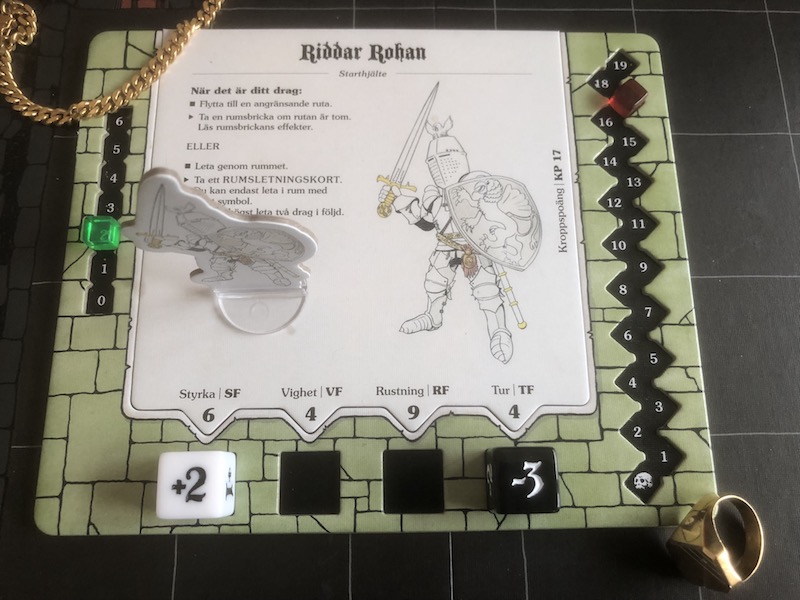 Old Riddar Rohan with a new dual layer player board to track items (green cube), health (red cube) and