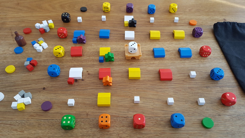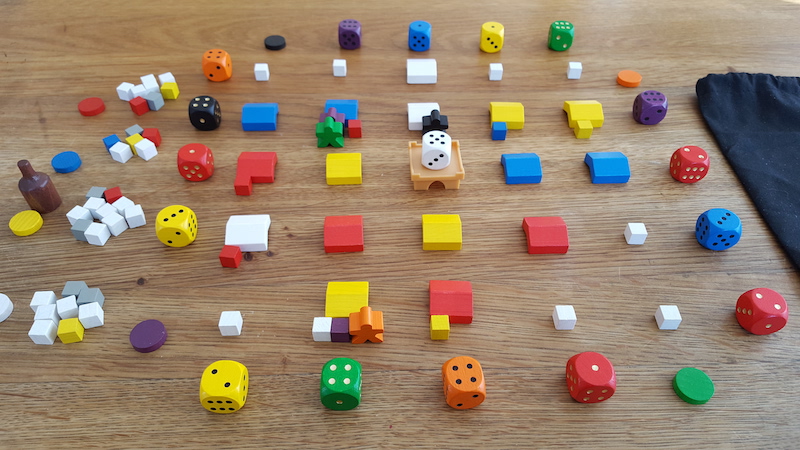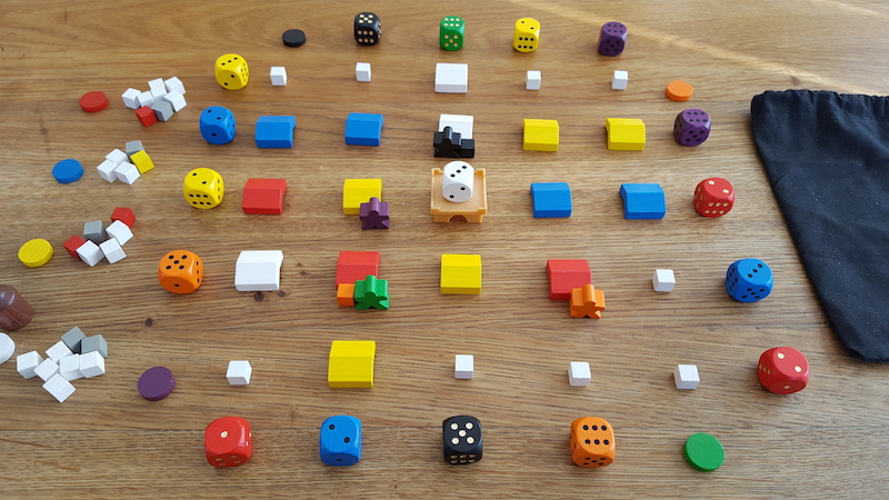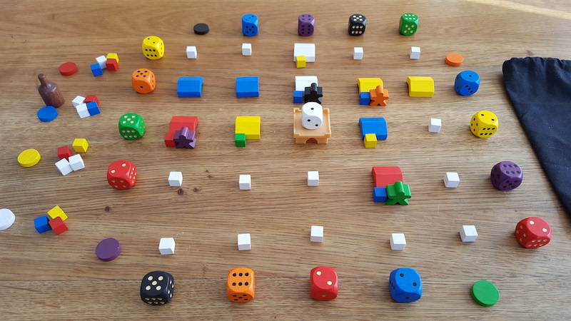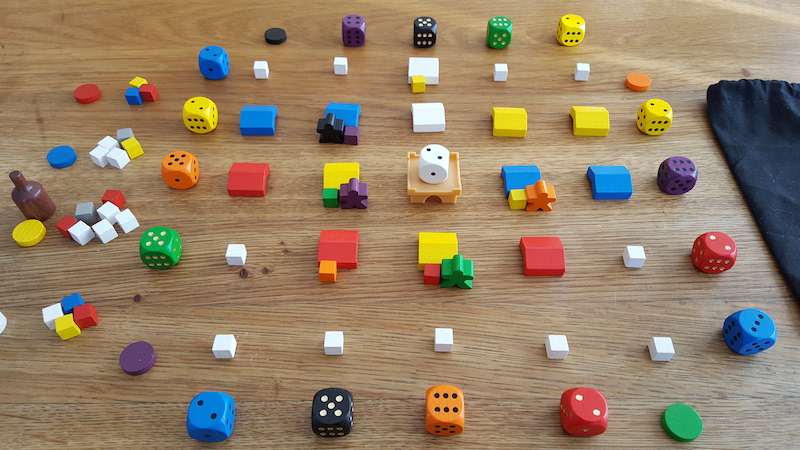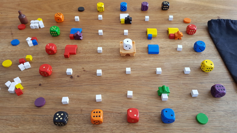 purple cube and a blue cube next to the green whisky baron. White places 1 yellow cube next to the