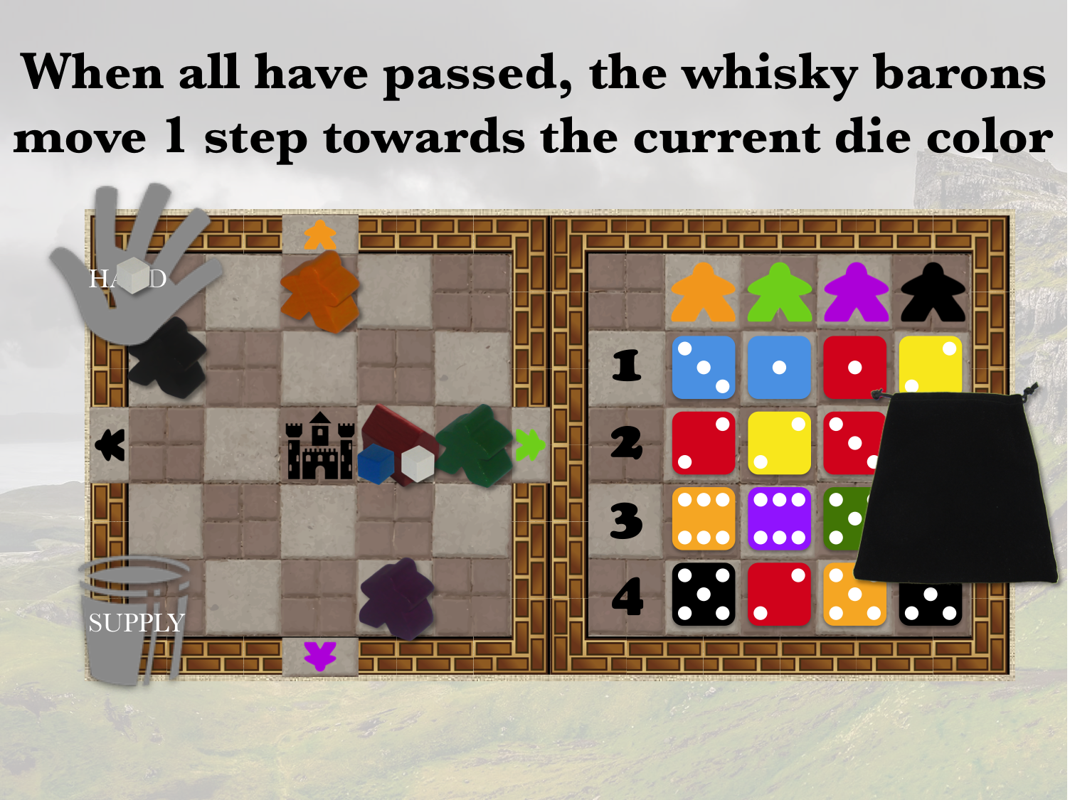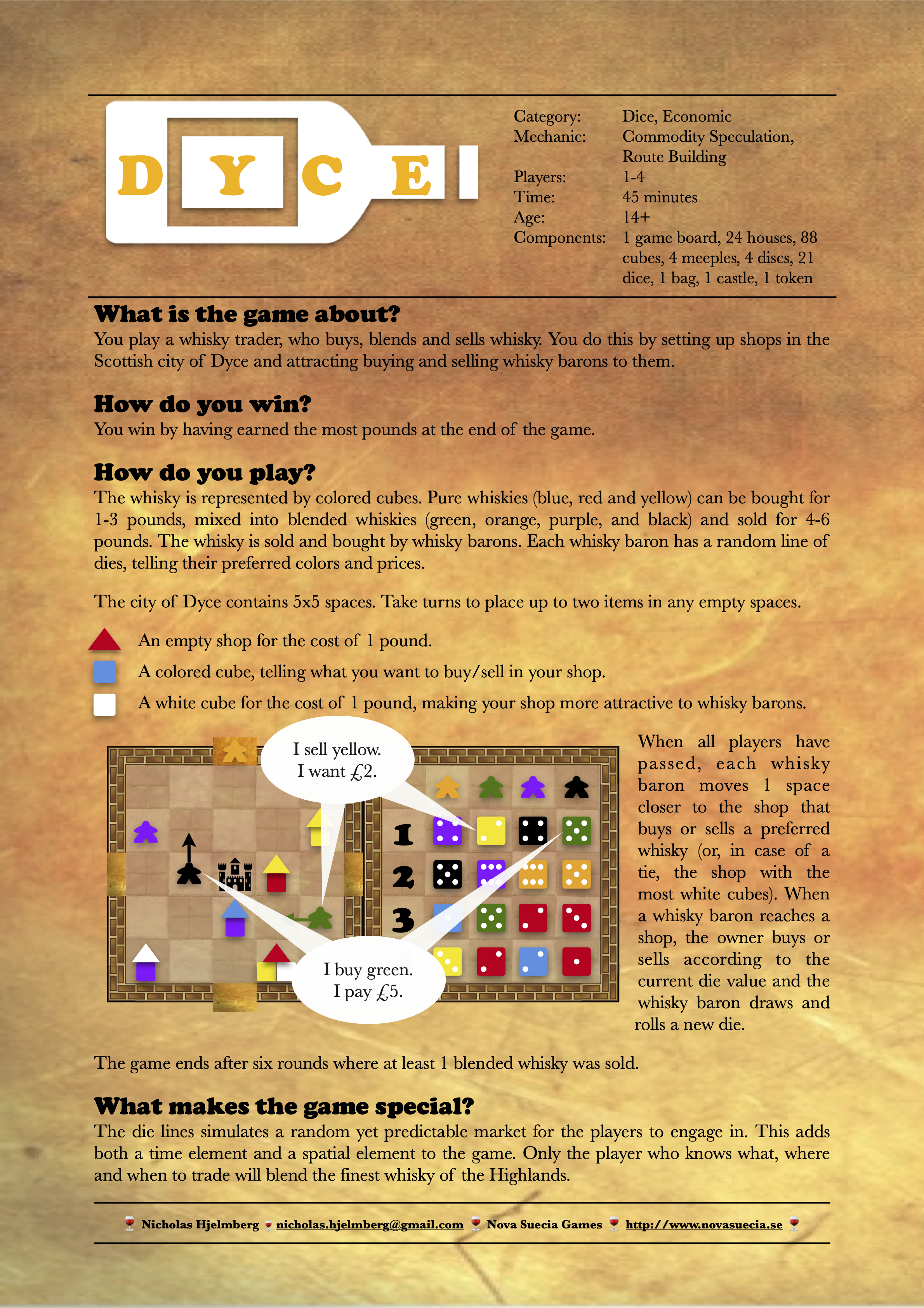 Dyce puts the players in the roles of whisky traders. The players take turns to place shops and trade whiskies in order to