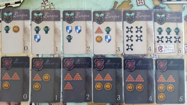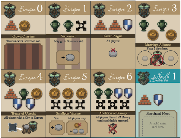 The new European Assets cards come with events affecting all players. Examples include the Great Plague (all players lose one population marker), the Marriage Alliance (force another player into an alliance that forbids attacks in Europe against one another) and of course the Abolition of Slavery known from the base version.