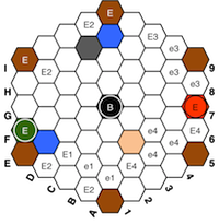 Explorers are marked with an upper case "E" and explored tiles with a lower case "e", both followed by