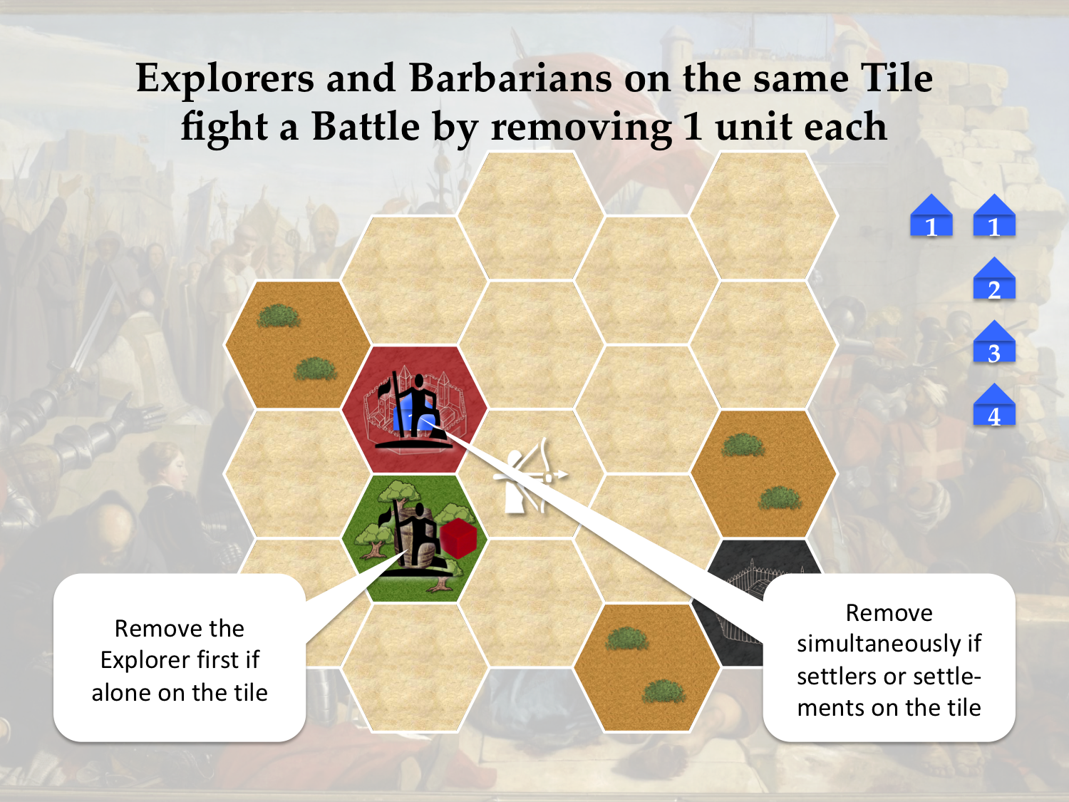 The barbarians on the other hand turn tiles face down and enable expulsions - the replacement of bigger settlements with smaller -