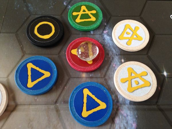 The initial design relied on fixed colors and relations, where each player had fixed number of tiles of each color to play and a fixed support from another color. The reason was simply to remove all randomness but this also gave the game a slightly lethargic feeling, as pointed out by some game testers. But could a game like Iconoclasm be both dynamic and non-random? The answer came from another cyclic abstract game: Tao Long, where a mancala mechanism governed which actions that are available for the players.