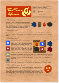 "Obviously, the actions conflict with each other and this is the essence of Tre Kronor Infernum: to choose actions that are likely to be supported by the other players' actions. Once a player has placed a save/steal marker in a room, the other players must deduce whether it is a save marker (in which case they have no interest in extinguishing the fire in that room) or whether it is a steal marker (in which case they want to extinguish the fire as soon as possible). With only one action at the time, each player must choose wisely."