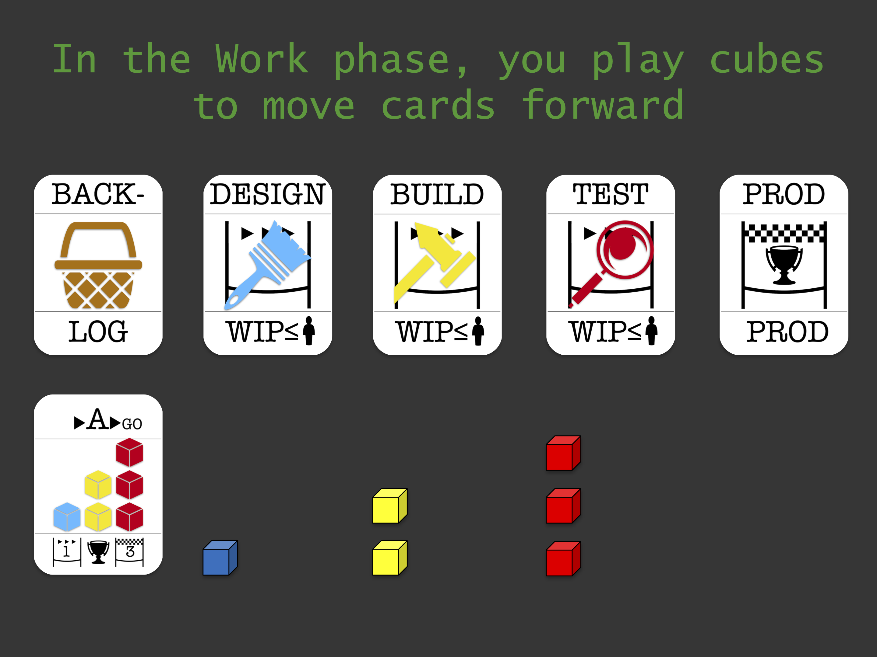 The work items are represented by cards and the resources by cubes, which have to be placed on the