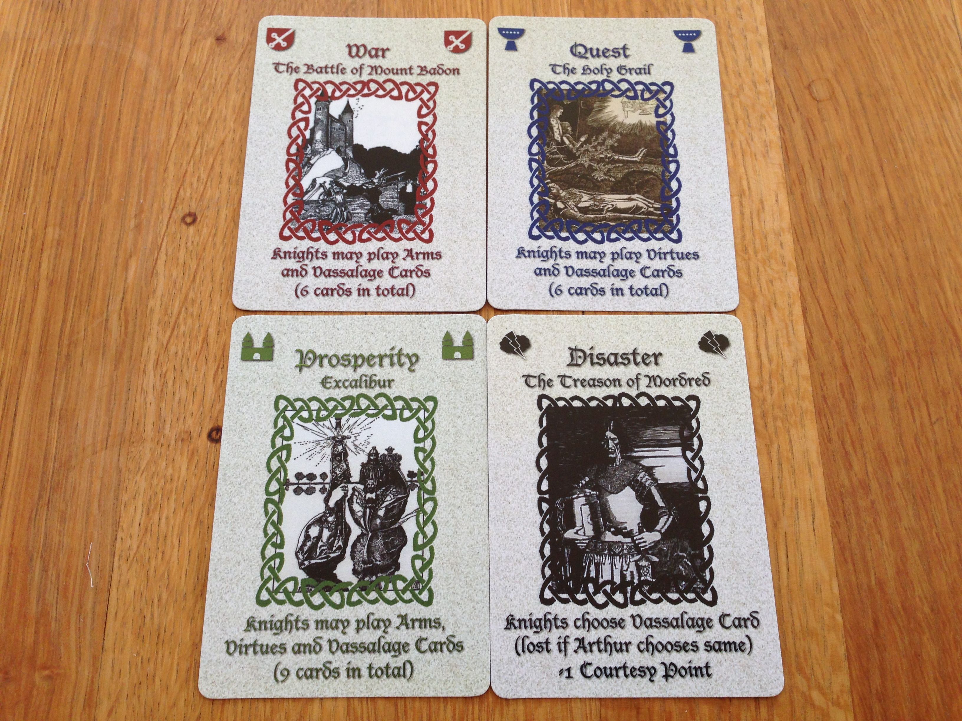 How about letting them use the cards to earn worship points (which, by the way, is the name of the victory points in another old Arthurian game: Excalibur)? Arms could be used in wars and virtues in quests while vassalage could be used as a mean to earn less but safer points. Also important is that the opportunity to earn worship points would give the knights an incentive to collect specific cards in a turn, something that the damosels may use to their advantage. The idea of the event cards and their match to chivalry cards was thus born.