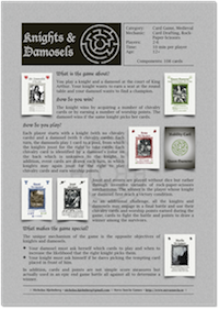But besides the above role playing, Knights & Damosels also offers many tactical opportunities. Knights may draw cards that leave their opponents with less options or even provoke them to risk a joust. Damosels may guess "their" knights' intentions and play the cards they need. The special rotating roles of Arthur and Merlin may be used to intentionally fail a quest to hurt opponents and reap all the rewards to the own knight or to find out which knights that are most influenced by the own damosel."