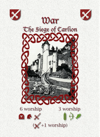 The chivalry cards are based both on history and legend. The equipment most commonly associated with a knight is the sword, the armor and the horse so those were self-evident. For the virtues of chivalry, there are many lists but the ones adhered to by the Knights of the Round Table were Honor, Honesty (included in Honor in the game since I only needed 3), Valor and Loyalty. Finally, a knight had vassal duties as well and in the game I divided them into the geographical areas of plain (farmer), forest (hunter) and sea (fisher).
