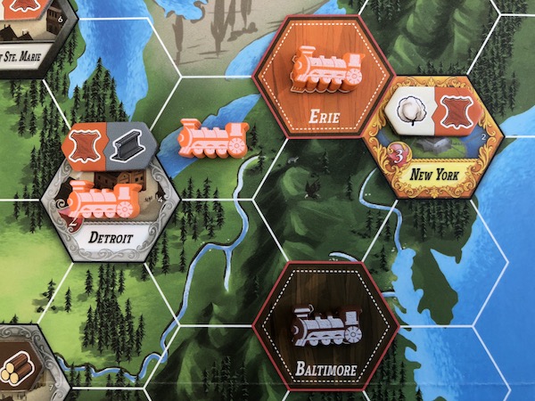 To lay tracks, a player chooses a city to connect to and takes as many trains from the rail company’s supply as needed