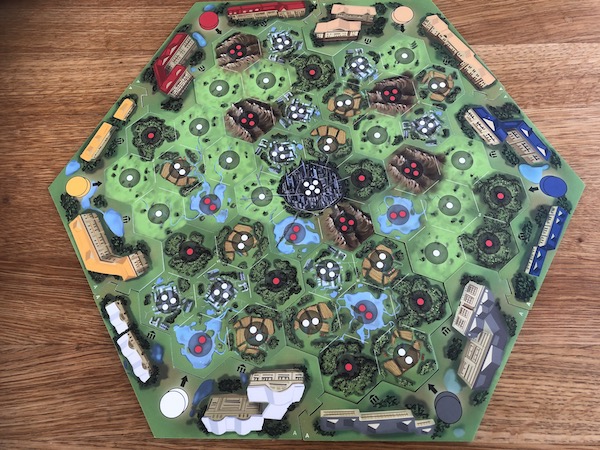 In the Draw Phase, two company discs per player plus one additional disc are drawn from a bag. Those discs provide not only the action decisions this round but also the turn order decision for the next round. This is because the discs are arranged from left to right and if you take the leftmost disc you'll go first next round, if you take the second leftmost disc you'll go second next round and so on.