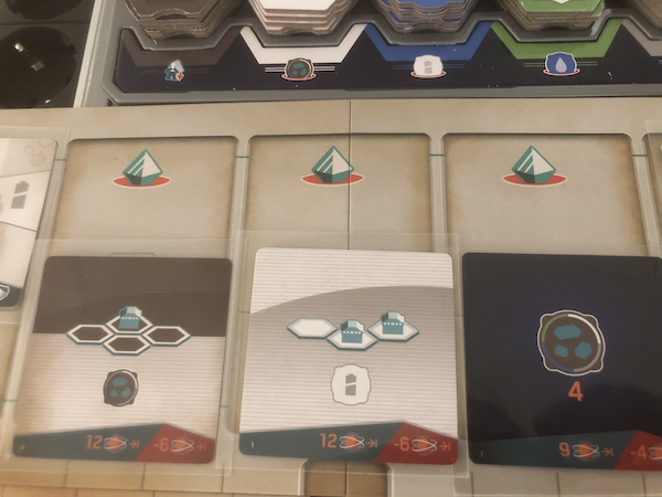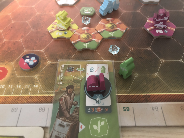The purpose of the bot is to build buildings and you must have it on or next to the hex where you're building. The purpose of the rover is to collect crystals en route and bonus tiles where it ends its movement. Some of the bonus tiles are placed at the setup, others as players travel between the orbit and the colony. It costs a precious action to move them around but you'll curse your greed when your bot is too far away from the critical building sites (a building may only be built adjacent to or exactly one hex away from similar buildings) and leaving a player to rove around on his own means leaving a lot of riches for free. There is even a "cheat" here where you build on the bot's hex, in which case you must displace it (read: move for free) to an adjacent hex. With good planning, you can move your bot to all places you need without wasting any actions. I can't help wondering if this was designed deliberately or if it was a side effect of an attempt to avoid cluttered hexes but it's one of many examples of small tactical tricks on Mars.