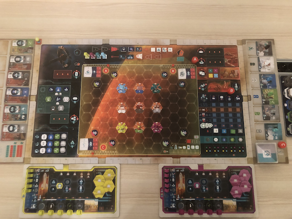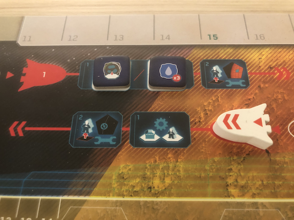In addition to all the traditional euro challenges of getting the right resources at the right time, there is a "dudes on a map mini game" on Mars. Besides the colonists, the players have one bot and one rover to move around (with the possibility of acquiring more bots during the game).