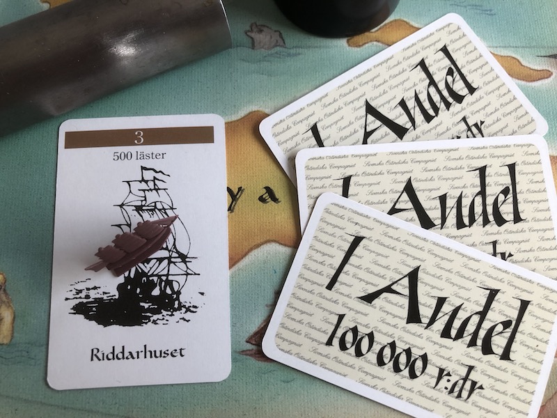 Your second decision is whether to use some of your profit to buy a share in the East Indian Company. This will determine the winner in the end, although you're in no hurry at the beginning of the game since they offer no other benefits. Focus on money for a 3rd ship and enough goods to fill all your ships first, then on shares. When all 16 shares have been sold, the player with the most shares wins.