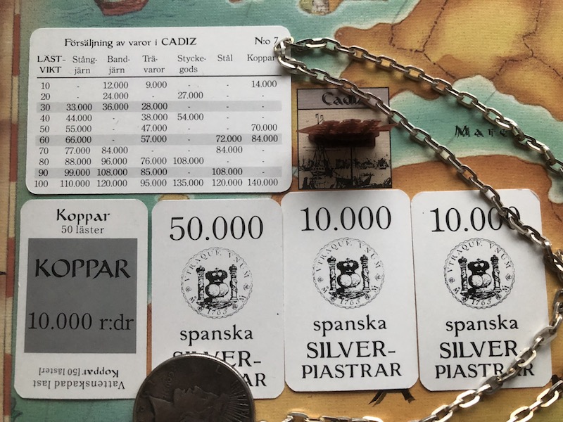 The first stop on the trading route is Cadiz in Spain, where you sell your domestic goods for silver. This stop offers two decisions. First, you must decide whether to accept the prices of the current market card or draw a new one. Second, you must decide which of your goods to trade now and which to keep until your next turn, when you hopefully draw a better market card. Note that while your riksdaler are available to all your ships, your silver is only available to the ship that actually has it.