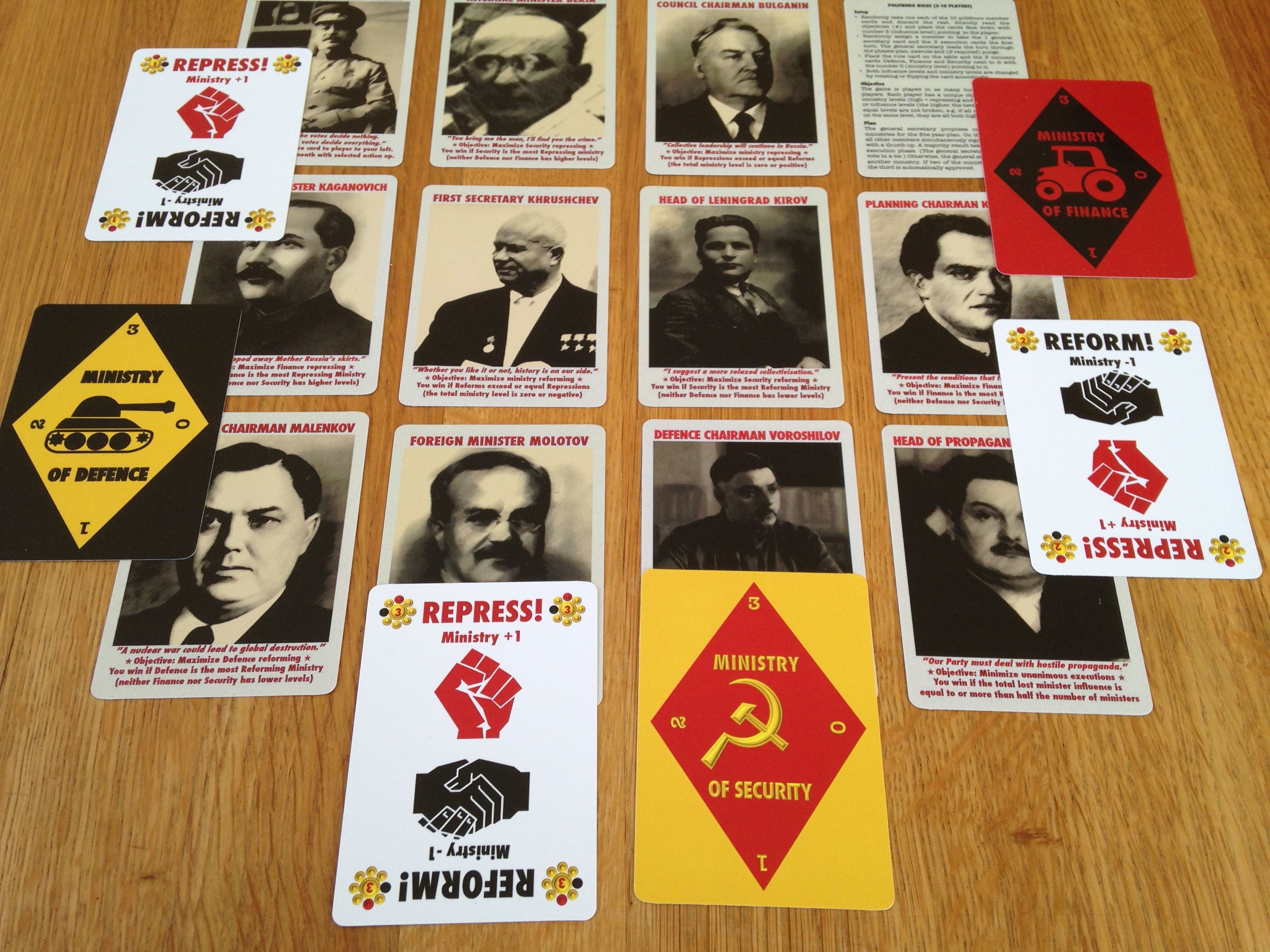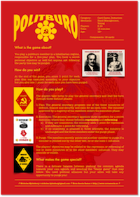 Politburo combines the classical elements of deduction and voting. You need to agree on a plan but all players have their own objectives that may coincide or collide and you must carefully seek your allies. But there is a third element as well: the purge, which allows you not only to thwart other players' objectives but also to blame someone else. All this for 5-10 players but only 18 cards!