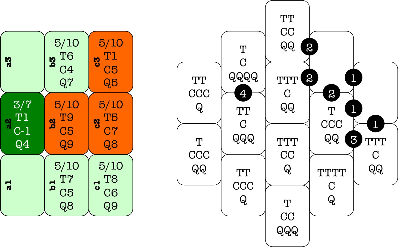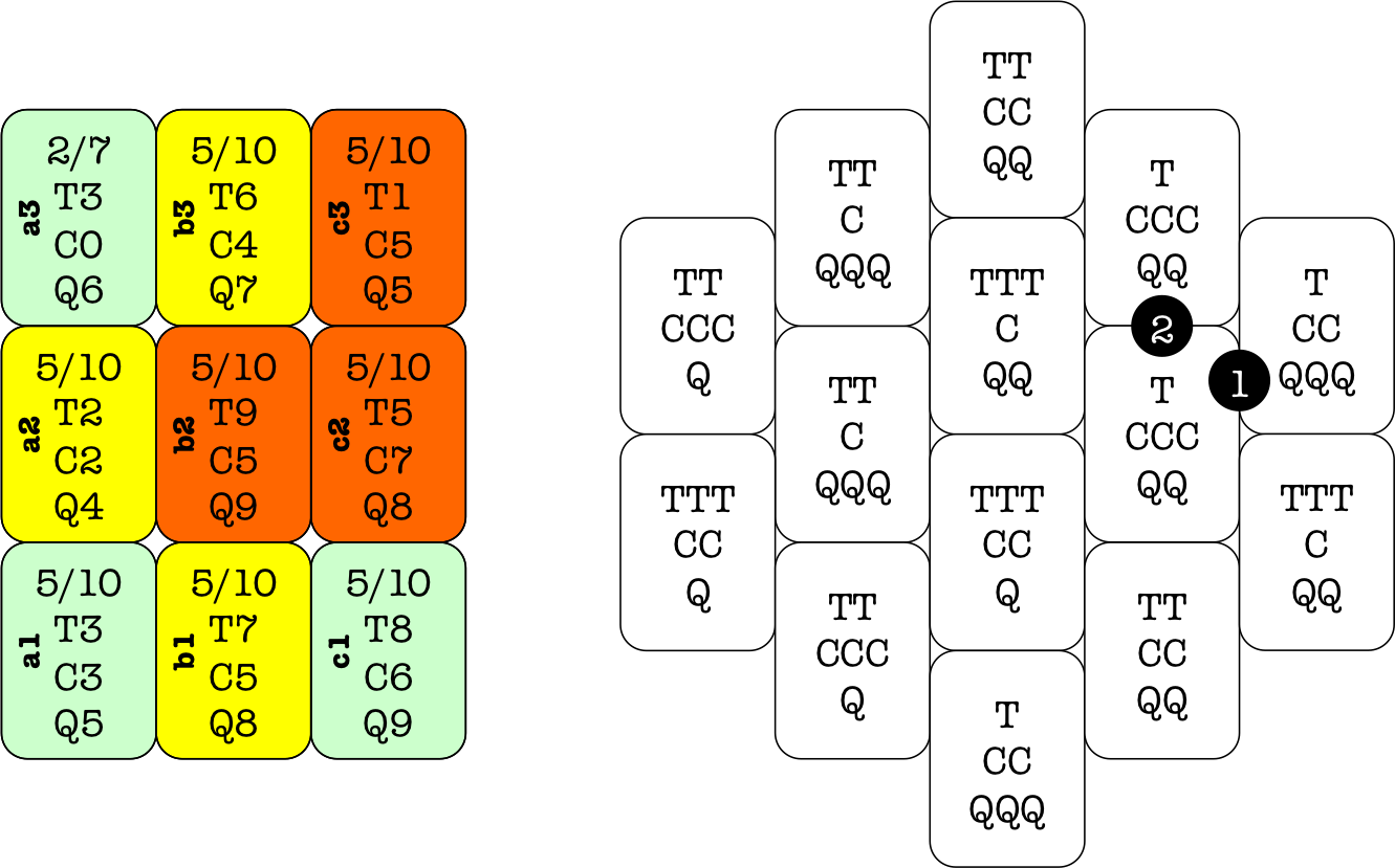 (T=time, c=cost 4, Q=quality) and numbered circles for the players' seats.