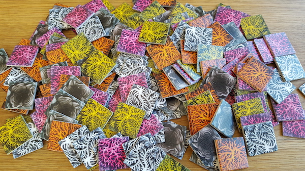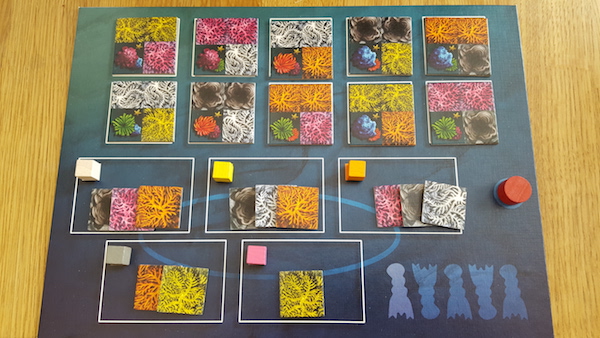 Third, you have larva cubes in the same colors as the polyp tiles. They are acquired during the game and