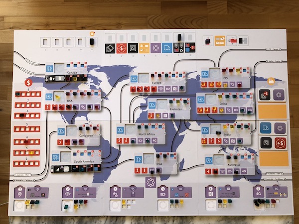 So how do all those streamlined actions manifest in the gameplay? A typical game starts with the players earning some easy victory points from their local markets while carefully improving their companies in areas where they will be the most competitive (i.e. areas with few other competitors). Some players focus on research or development, others on expansions to new markets.