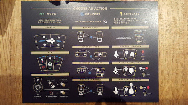 The player aide illustrating the actions. Note how certain actions require sundivers in certain patterns.