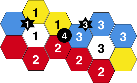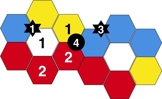 city and takes 1 iron and and crop+ore=textile from player 3's shops. The mission earns player 1 the first mission chit