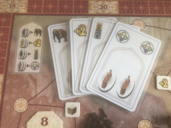 The special cards have unique bonuses: an elephant, +2 victory points, a Grand Mogul and the ability to play a card of another color.