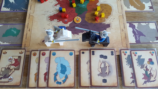 A more valid argument concerns the theme. I don't agree that the idea of controlling the controller is unthematic but I do agree that the setting of post-Arthurian Britain is strange. Not even King Arthur (or whoever the man behind the myth was) managed to unite Romano-British, Picts and Welsh so why would his successor manage that? Uniting Anglo-Saxon kings against the Vikings would have made more sense, as of course the original setting of King of Siam, but I guess King Arthur has more market value.