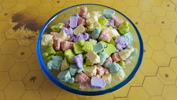 First of all, you do not place tiles but colorful camels. Functionally there is no difference compared to tiles but the camels do stand out on the board, for better or worse. Some players shudder at the very thought of playing with pink plastic camels while color-blind players find it difficult to tell the camels apart. If you belong to either category, Through the Desert is not for you. Otherwise, please read on.