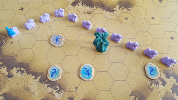 But this is not the only reward. Each enclosed hex scores 1 victory point, something that can amount up to 20 victory points or more if you are successful. Hence, Through the Desert is not a race game for points, it is also a blocking game to prevent opponent points.