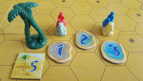 Since you are in a desert, you go to the water. Duh! The two most obvious ways to score is to place your camels on water hole tiles (which earns you 1-3 victory points as printed on the tile) or next to a palm tree (which earns you 5 victory points). That may sound easy but remember that you cannot go there by yourself, you have to build a caravan all the way there. Also remember that there are other camels in the desert that will do all they can to beat you to the valuable spots.