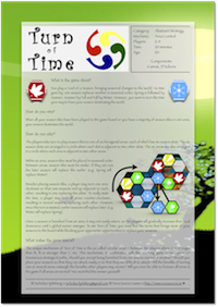 Turn of Times is a simple and yet tactically deep game where players take turns to place their seasons in the world. Initially, the seasons are in balance with Spring followed by Summer, Summer by Fall and Fall by Winter as time goes by. However, the players may also literally turn the time to their advantage by turning the game board parts so that later seasons replace earlier until their own season dominates the world. But time is not meddled with without danger. As your season enters one part, other seasons may enter other parts with unpredicted results. And if the the time is turned back in the entire world, not even the Lords of the Seasons may predict what happens. Will the world have eternal summer or eternal winter? Play Turn of Times and find out!