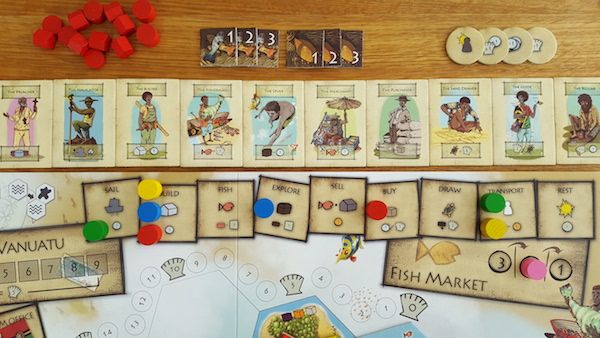 In addition to selecting the actions, the players also select characters each round. A character is typically linked to an action and provides a certain bonus for taking it. One example is the Builder, who builds for less vatu, and another one is the Diver, who earns vatu in addition to victory points for exploring treasures.