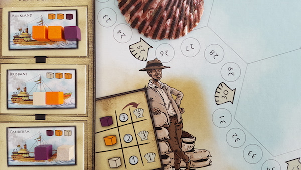 Most actions in the list above are linked to where your ship is and which pieces and spaces that are available on the tiles around it. Build and drawing spaces are limited, tourist pawns are limited, as is the capacity of an island to receive them, treasure and fish discs are limited and so on. The only exception concern the Buy action, where completely exhausted islands get new goods and where completely filled ships get replaced.